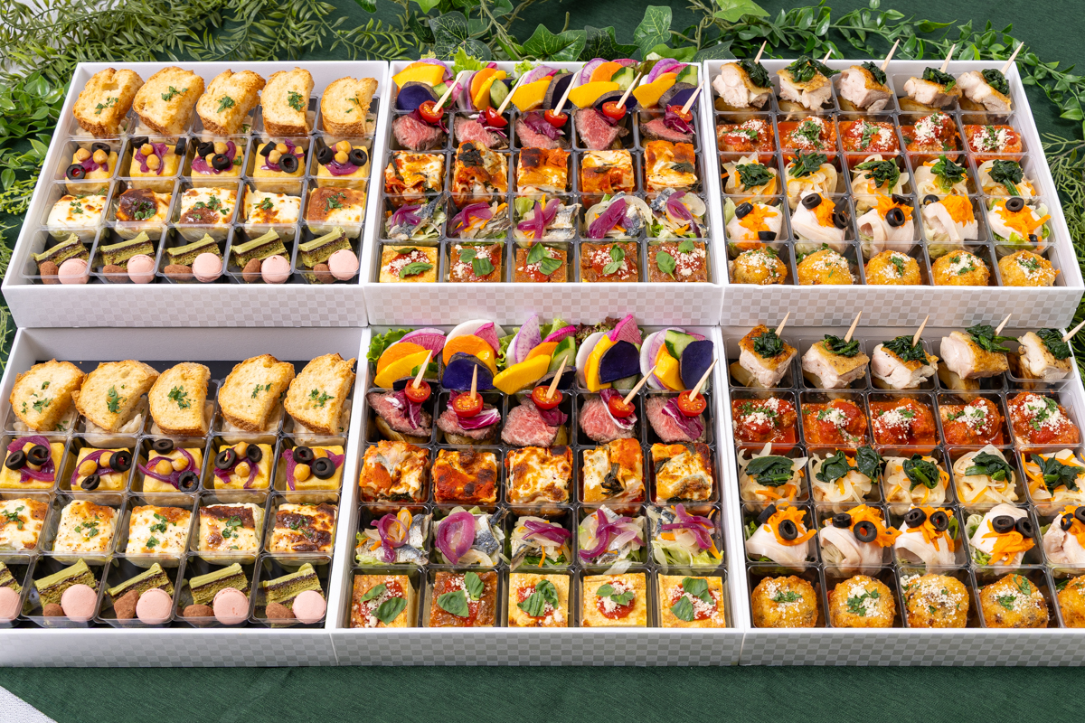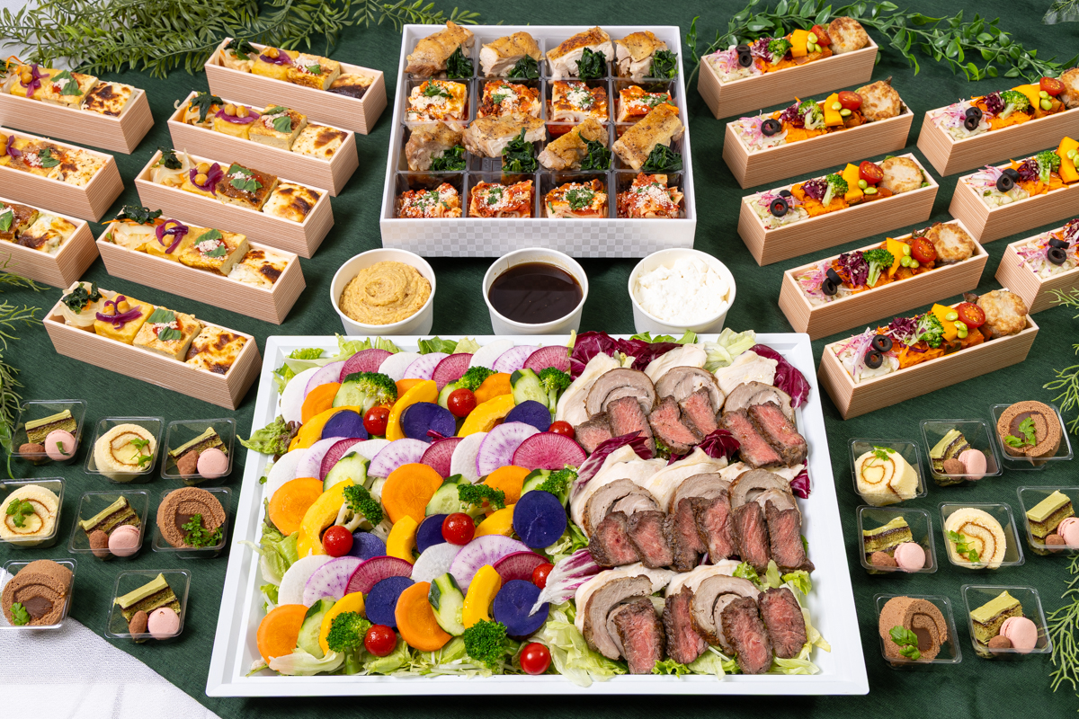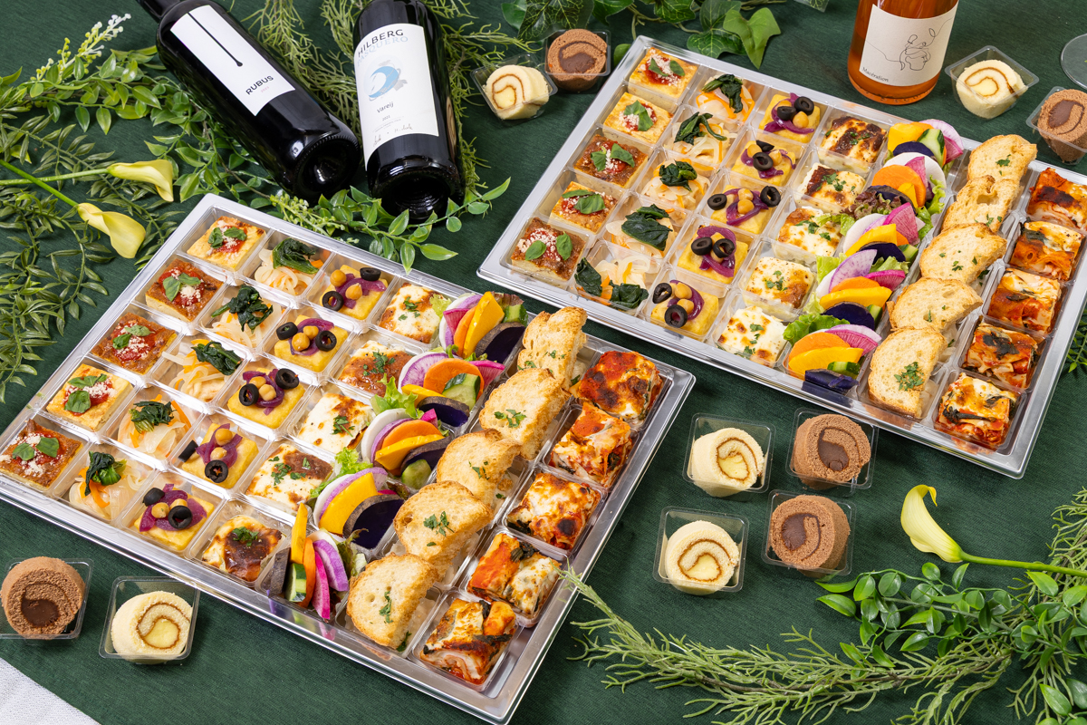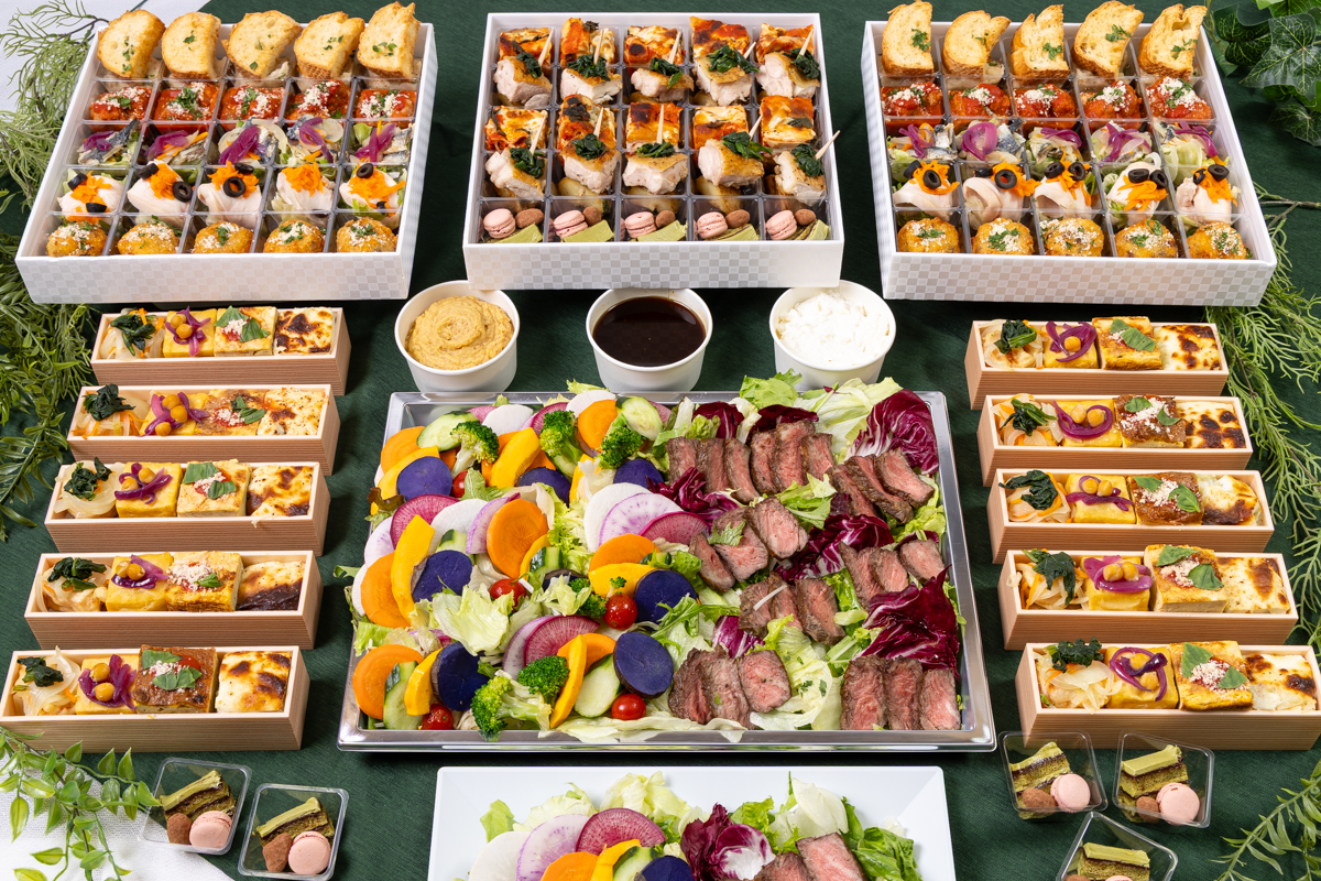フリッタータ(イタリアンオムレツ) / パニッサ(ひよこ豆のフリット) / 野菜スティック / サオール(イタリアン南蛮漬け) / 旬野菜の衣揚げと野菜のマリネ / 低温調理のしっとり鶏ハム / 野菜のグラタン / アランチーニ(ライスコロッケ) / ポルペッティ(イタリアンミートボール) / 牛ランプローストビーフピンチョス / ラザニア / 2色のロールケーキ